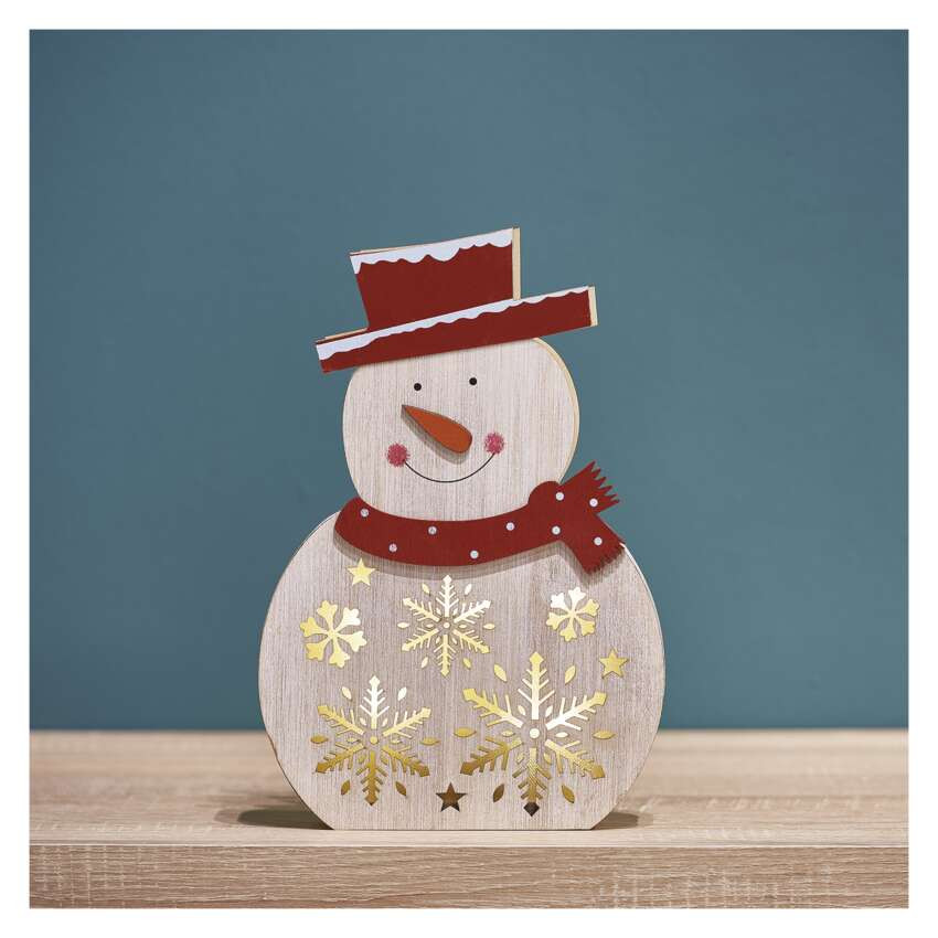 dekorace sněhuláka je vybavena příjemným teplým bílým osvětlením.