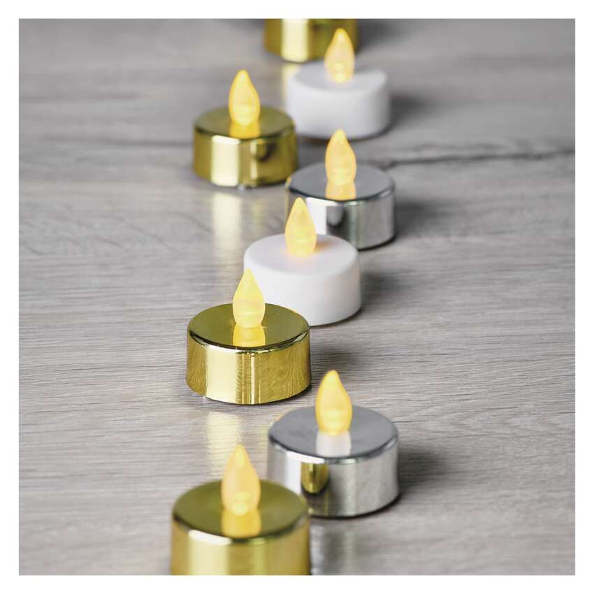 stříbrné svíčky, které jako zdroj světla používají úsporné LED diody,